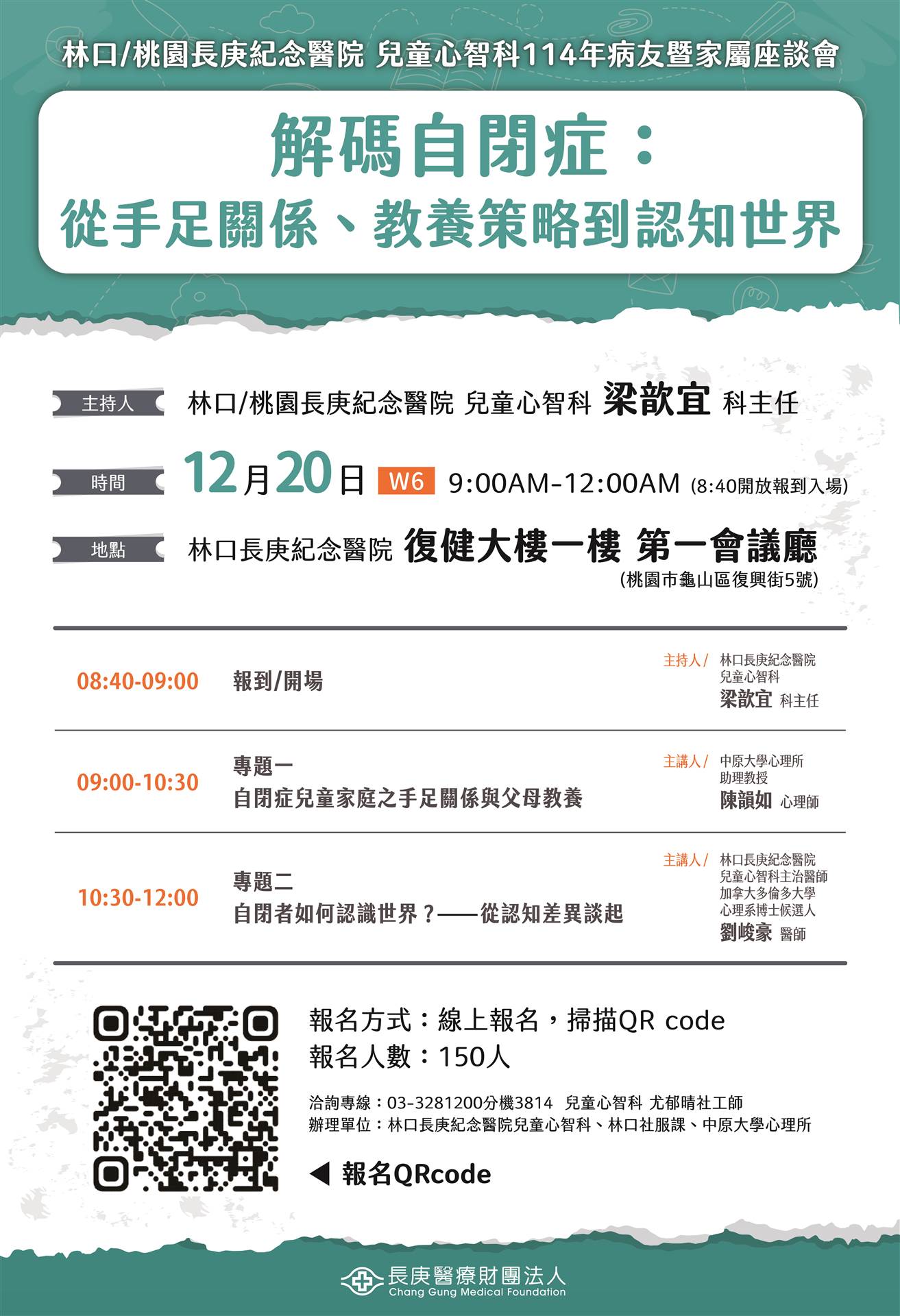 長庚醫療財團法人林口長庚紀念醫院(以下稱長庚醫 院) 辦理兒童心智科病友暨家屬座談會「解碼自閉症:從 手足關係、教養策略到認知世界」 | |